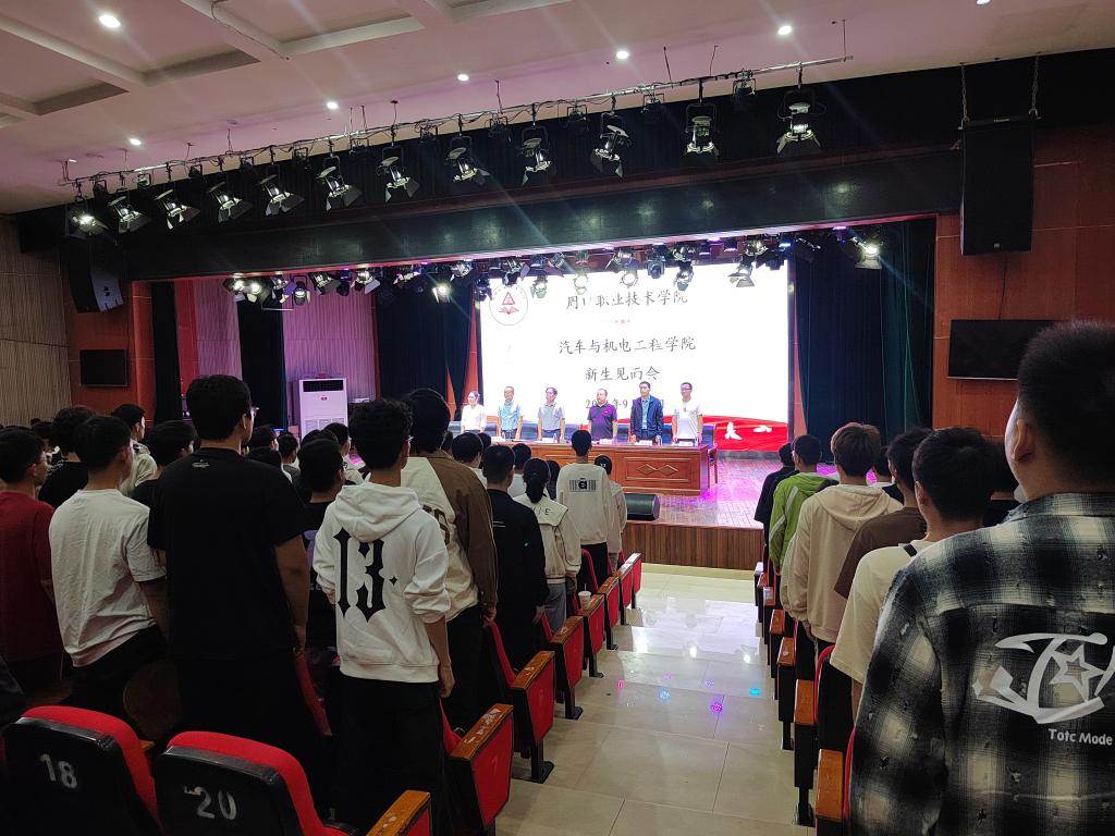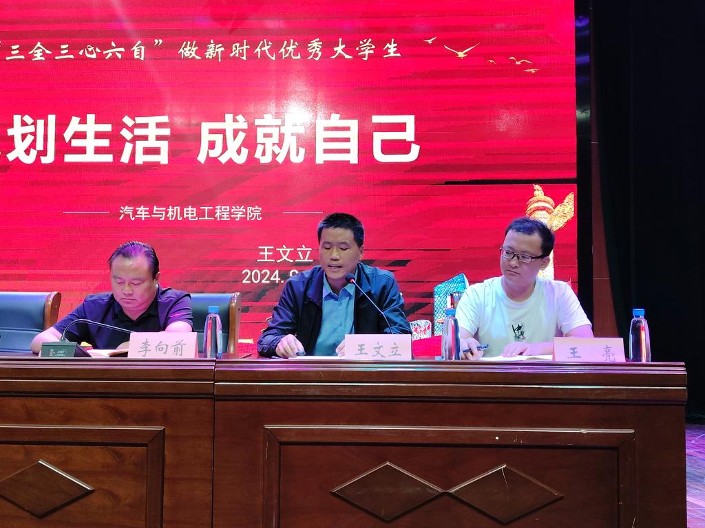 王文立副院长就学生工作发表讲话,主要讲四个方面勉励新生。一是养成良好习惯,培育优秀品质。对学生手册关于纪律、卫生、考试和学籍管理做了重点解读,帮助同学们树立良好习惯;二是鼓励学生加入各类平台,增长自己本领。如校院学生会、篮球队、自律委员会、国旗队等等,鼓励同学们积极参加技能比赛,培养综合能力;三是帮助困难学生,无忧完成学业。对国家和学校资助政策宣讲,让学生通俗易懂了解资助知识,上学后顾无忧。最后,他勉励同学们规划大学人生,实现优质就业。他着重介绍“职创有心”就业创业辅导员工作室,以实现职业测评、兴趣评估等,为就业创业做好指导。