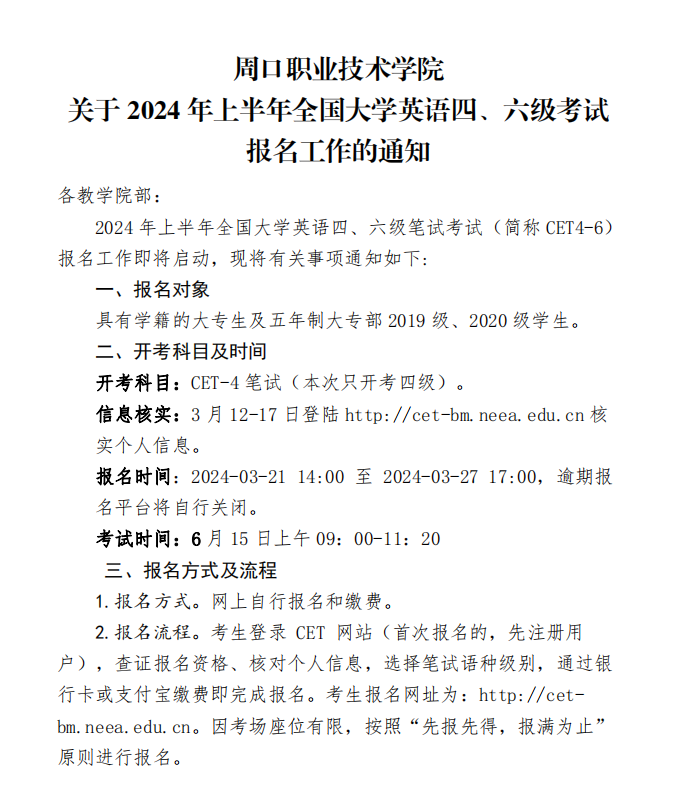 关于2024年上半年全国大学英语四、六级考试报名工作的通知