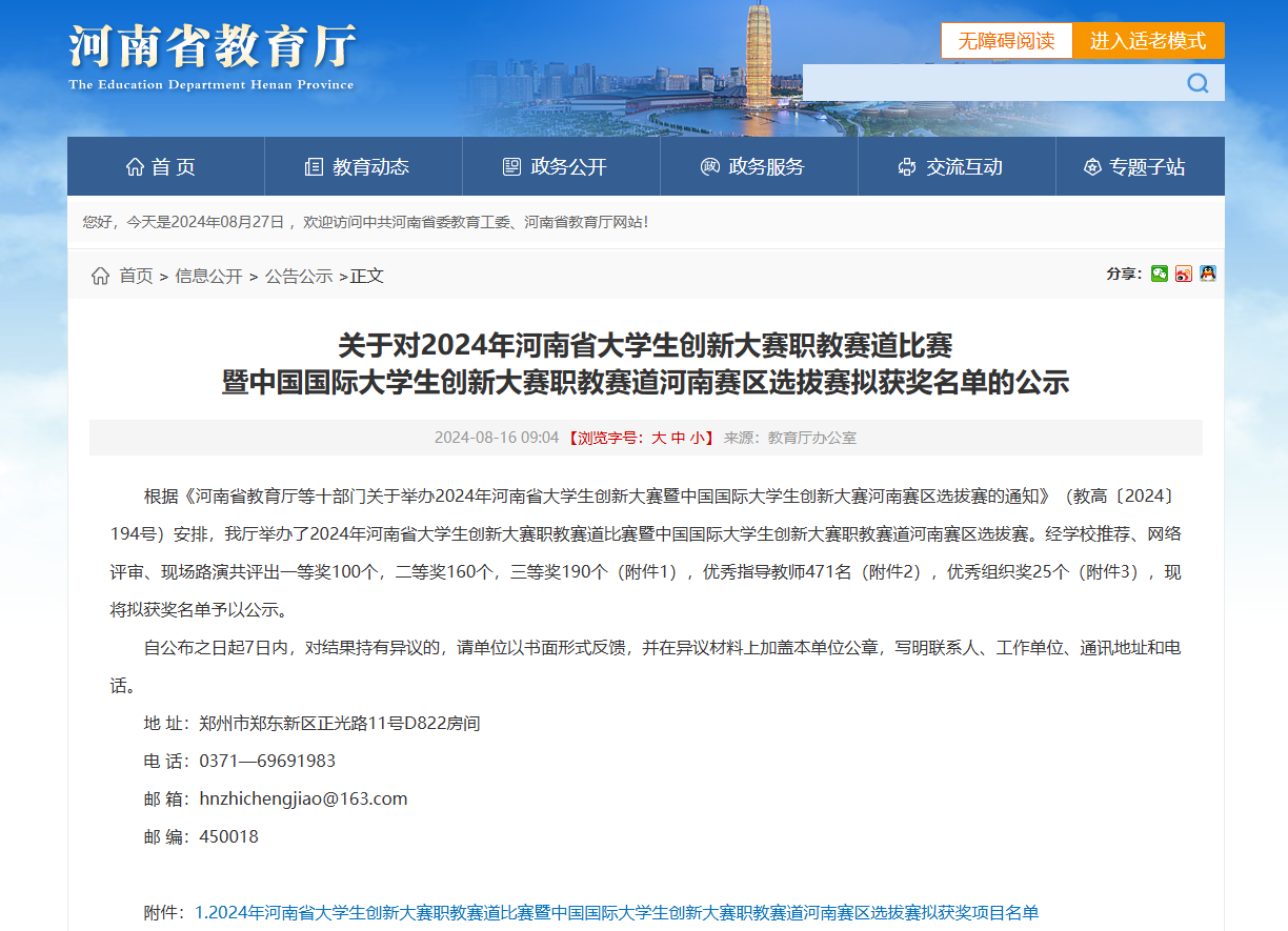 近日,教育厅办公室发布了《关于对2024年河南省大学生创新大赛职教赛道比赛暨中国国际大学生创新大赛职教赛道河南赛区选拔赛拟获奖名单的公示》。我院在本次大赛中获创意组一等奖1项,二等奖2项,三等奖2项的好成绩。同时我校被授予2024年河南省“互联网+”大学生创新创业大赛职教赛道优秀组织奖的荣誉称号。