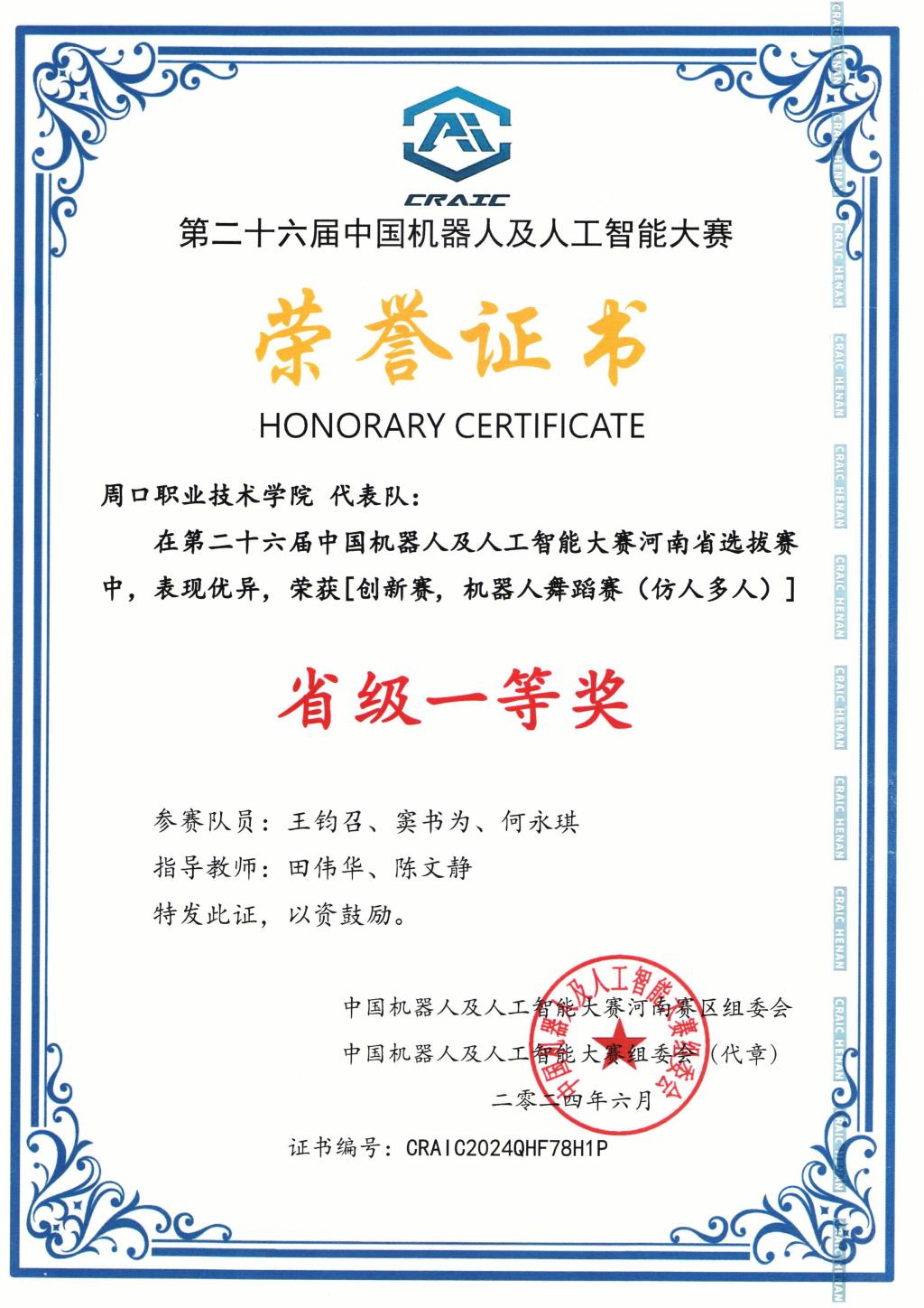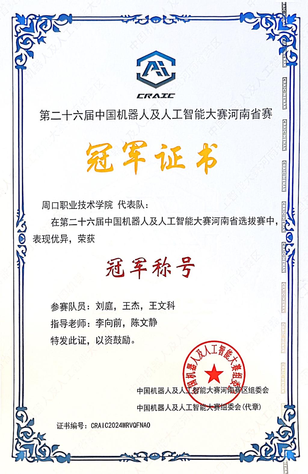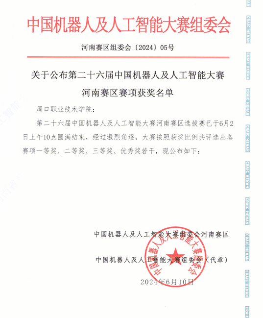 近日,第二十六届中国机器人及人工智能大赛河南赛区组委会发布了《关于公布第二十六届中国机器人及人工智能大赛河南省赛区赛项获奖名单》。我院在机器人多人舞赛项中荣获一等奖2项,其中李向前、陈文静指导的刘庭、王杰、王文科战队获得冠军。