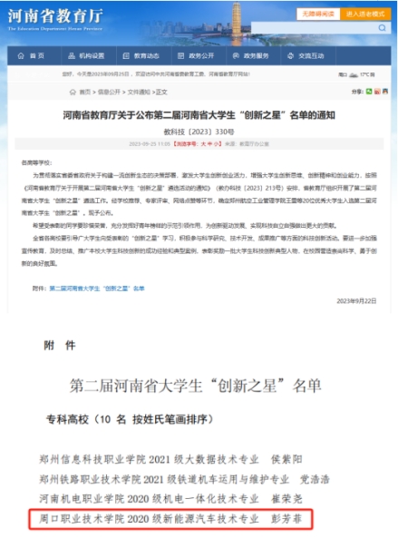 2023年9月22日,河南省教育厅公布了第二届河南省大学生“创新之星”名单,此次共评选出年度大学生“创新之星”20名。经过二级学院(部)推荐、学校推荐、专家评审、网络点赞、公示等环节,无套高清析度高潮内射视频新能源汽车技术专业2023届毕业生彭芳菲荣获第二届河南省大学生“创新之星”荣誉称号,这是我学院学子连续两届获此殊荣。