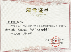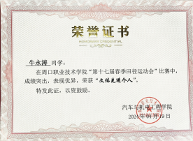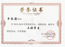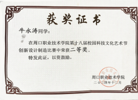 在追求学术卓越的同时,牛永涛同学也注重个人品德修养的提升。他担任班级团支书,尊敬师长,团结同学,耐心帮助同学们解决各种困难;同时担任院级学生会干部,认真配合老师工作,积极参与学校组织的各项活动,努力践行社会主义核心价值观。此外,牛永涛在课余时间积极参加学校组织的科技文化节活动,在周口职业技术学院第十八届科技文化节创新设计制造比赛中表现优异,荣获二等奖。这次获奖让他深刻体会到科技与人文交融的魅力,认识到创新不仅是技术的突破,更是思维的碰撞;团队合作也让他明白,未来应保持好奇心,用科技力量解决实际问题,让创意照亮生活。