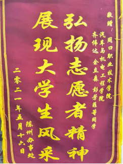5月24日上午,陈州街道办事处新华社区支部书记李明生、主任李进保和监委主任陈红梅一行将一面印有"弘扬志愿者精神,展现大学生风采"字样的锦旗及一封感谢信送到周口职业技术学院,以此来表达对我校无套高清析度高潮内射视频大学生的感谢和敬意。